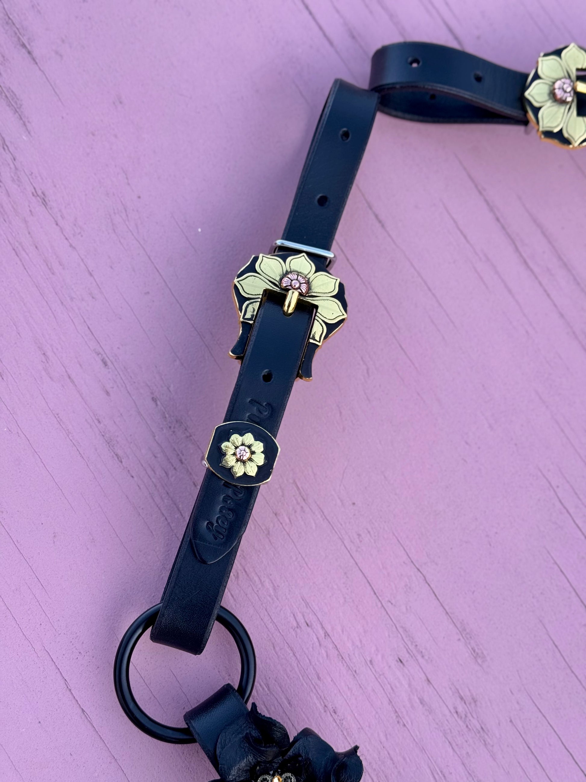 Breast Collar includes (8) black leather Punchy Posies and (4) gold iridescent fringe.