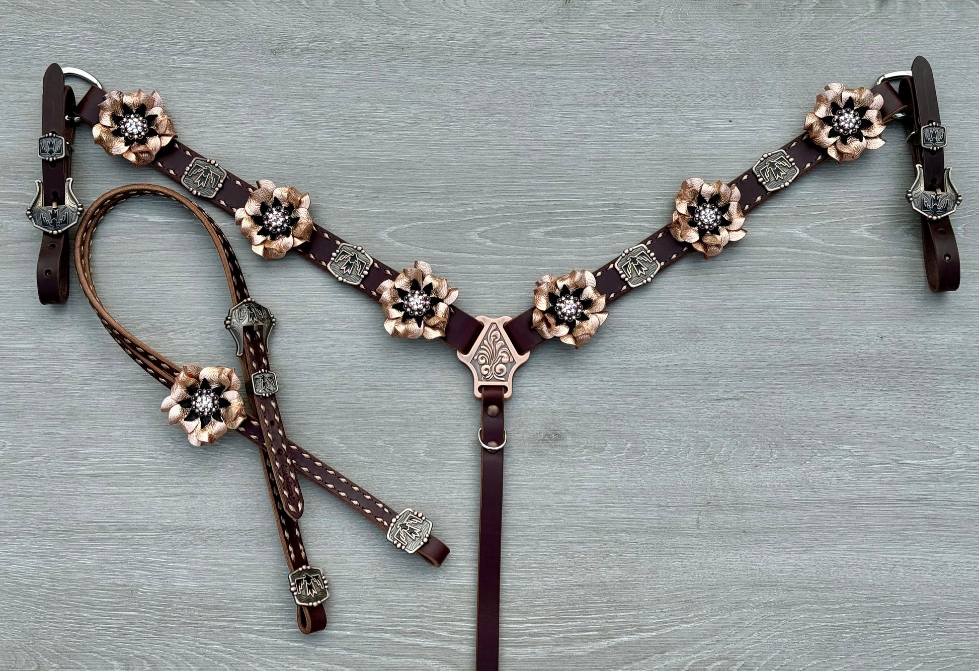 The flower conchos are made from rose gold leather with antique copper conchos encrusted with AB glass crystals. This set includes black thunderbird buckles and matching conchos.
