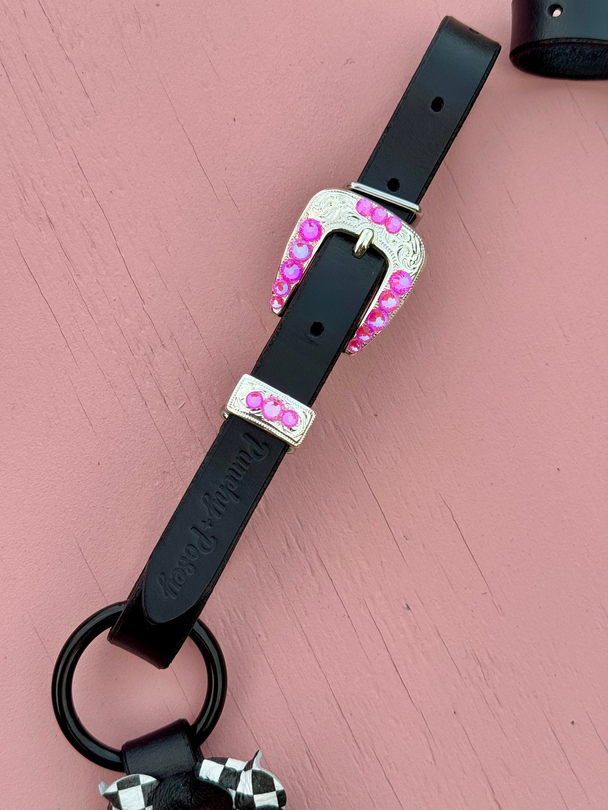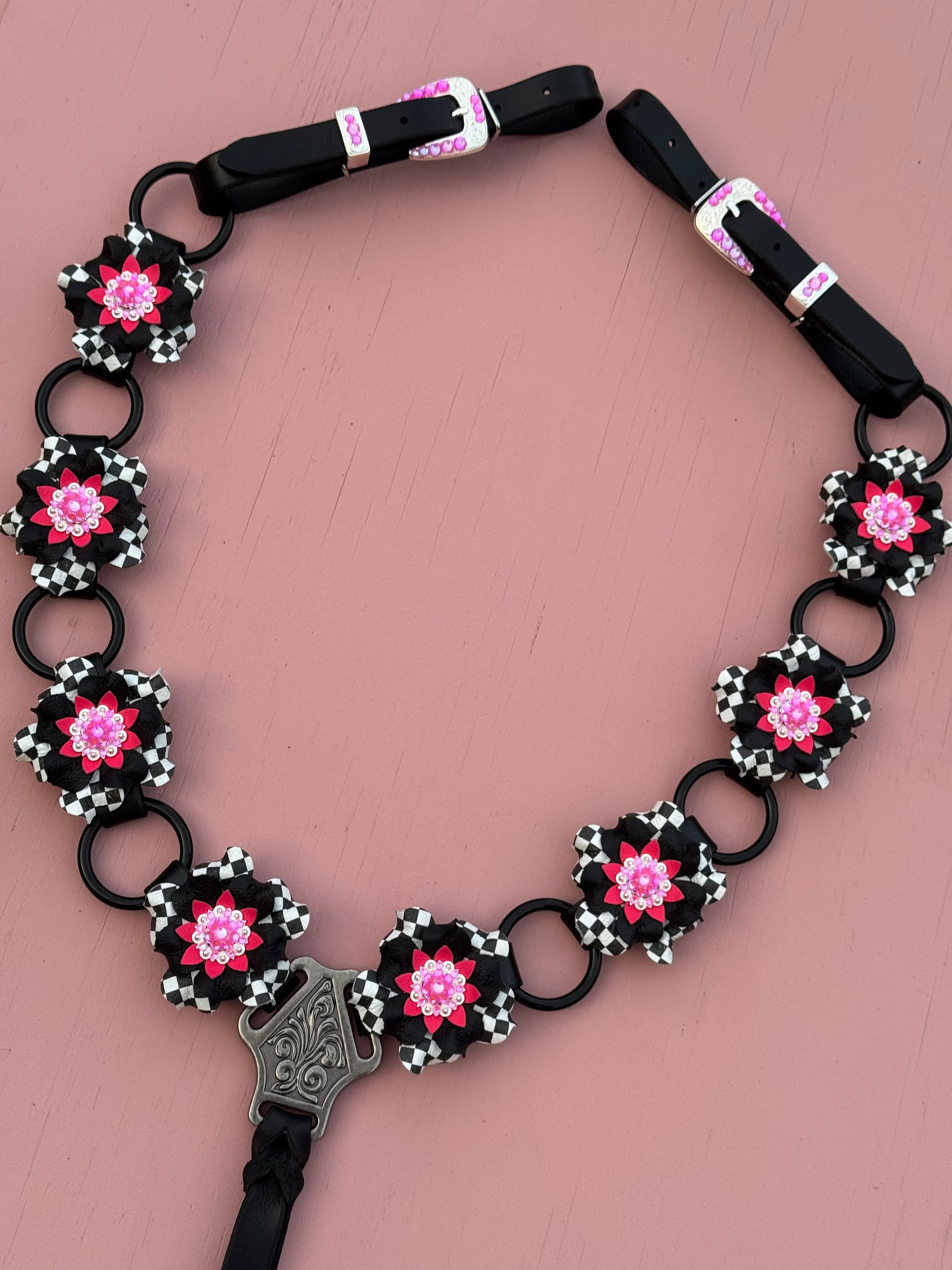Breast Collar includes (8) pink/ black checker leather Punchy Posies, and features neon pink bling silver hardware.