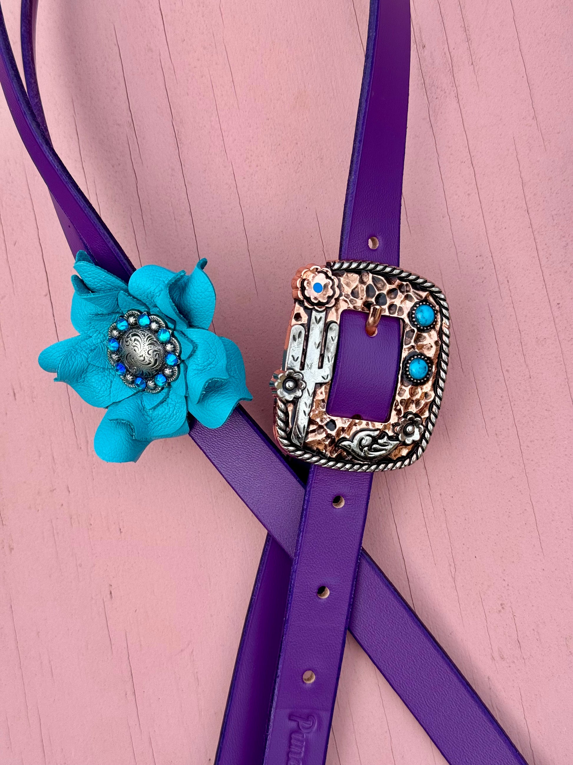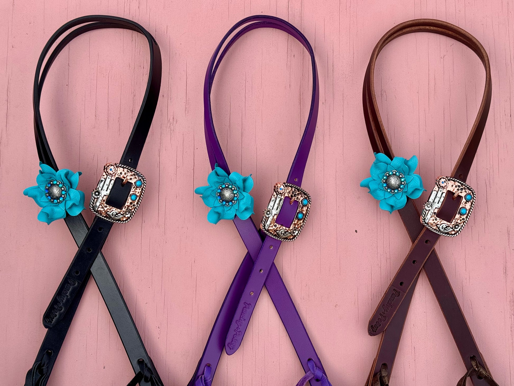 Headstall comes with turquoise Punchy Posey that is encrusted in teal shimmer rhinestones and turquoise cactus buckle.