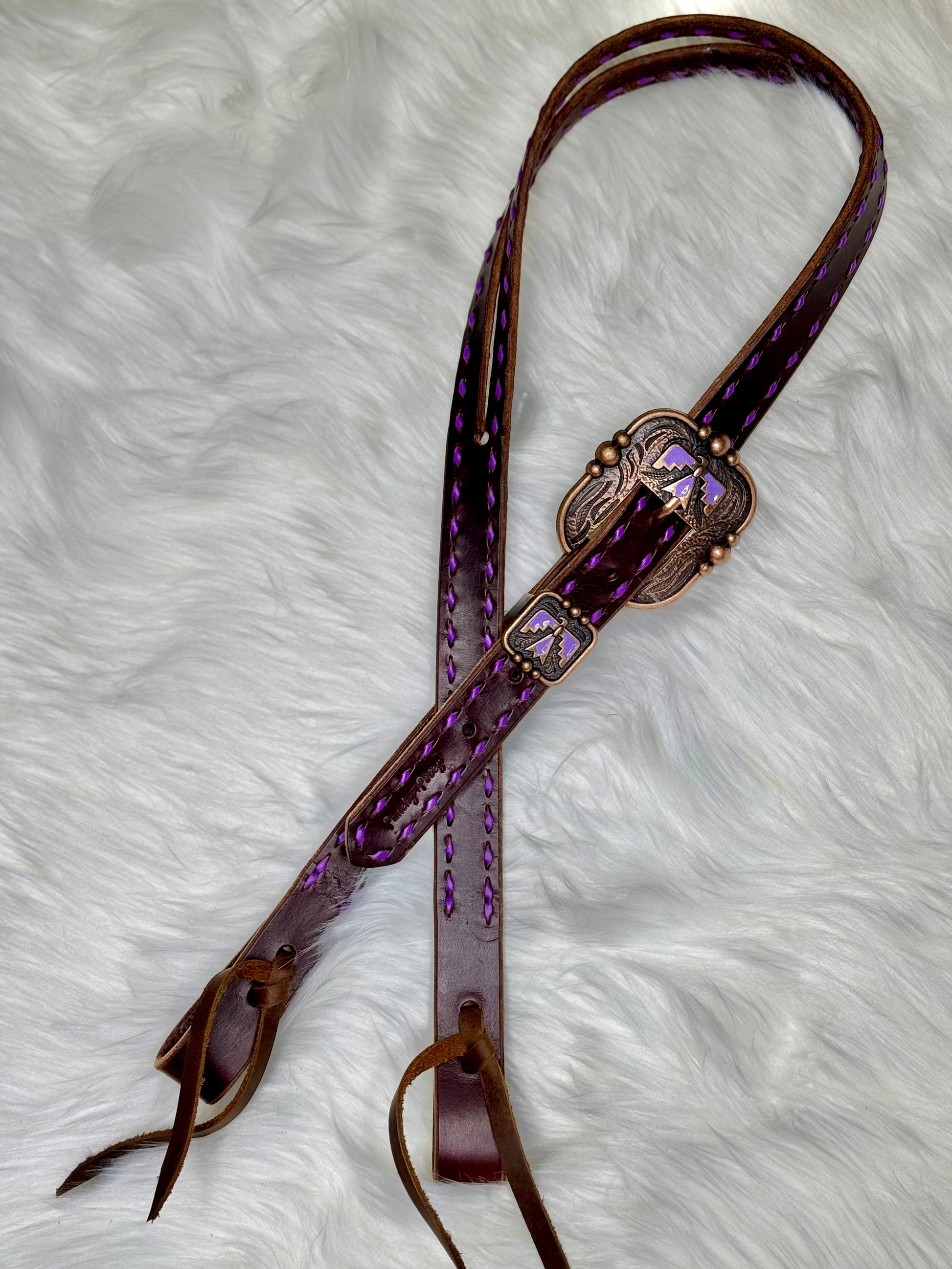 Chocolate and purple thunderbird headstall. Headstall features purple kangaroo lace and purple thunderbird buckle.