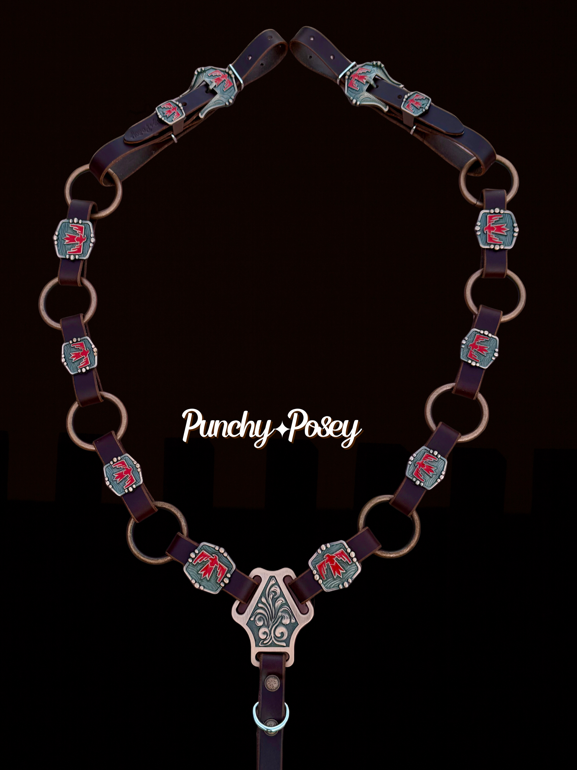 • Breast collar is accented in red Thunderbird buckles with antique copper rings.