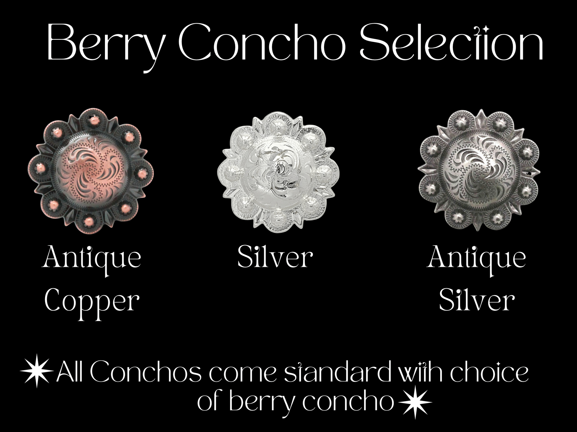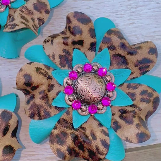 Our Punchy Posies are made out of genuine cowhide leather and accented with the highest quality crystals. The leather flower is assembled onto a 1" berry concho making the total size about 2.8"-3".